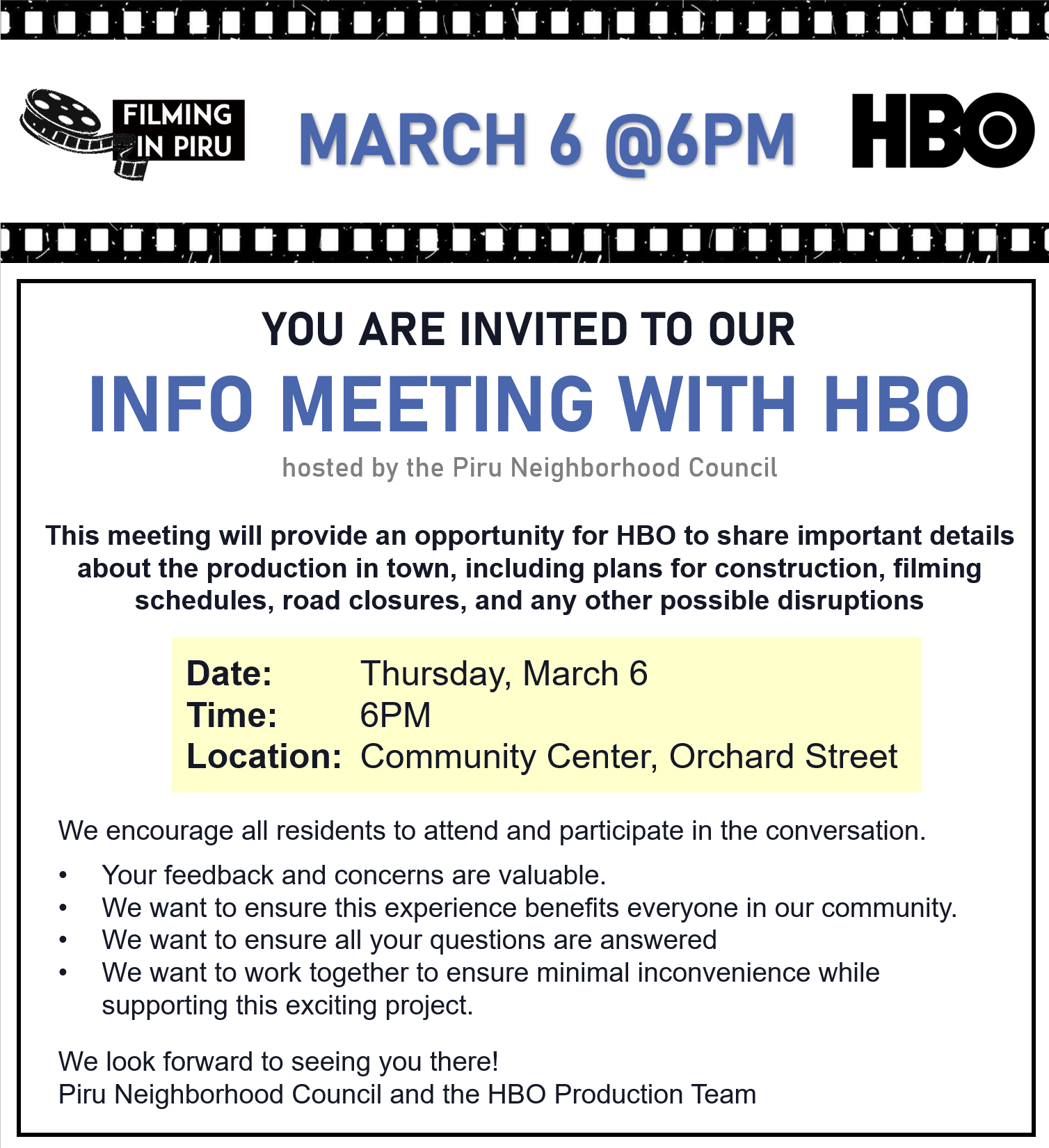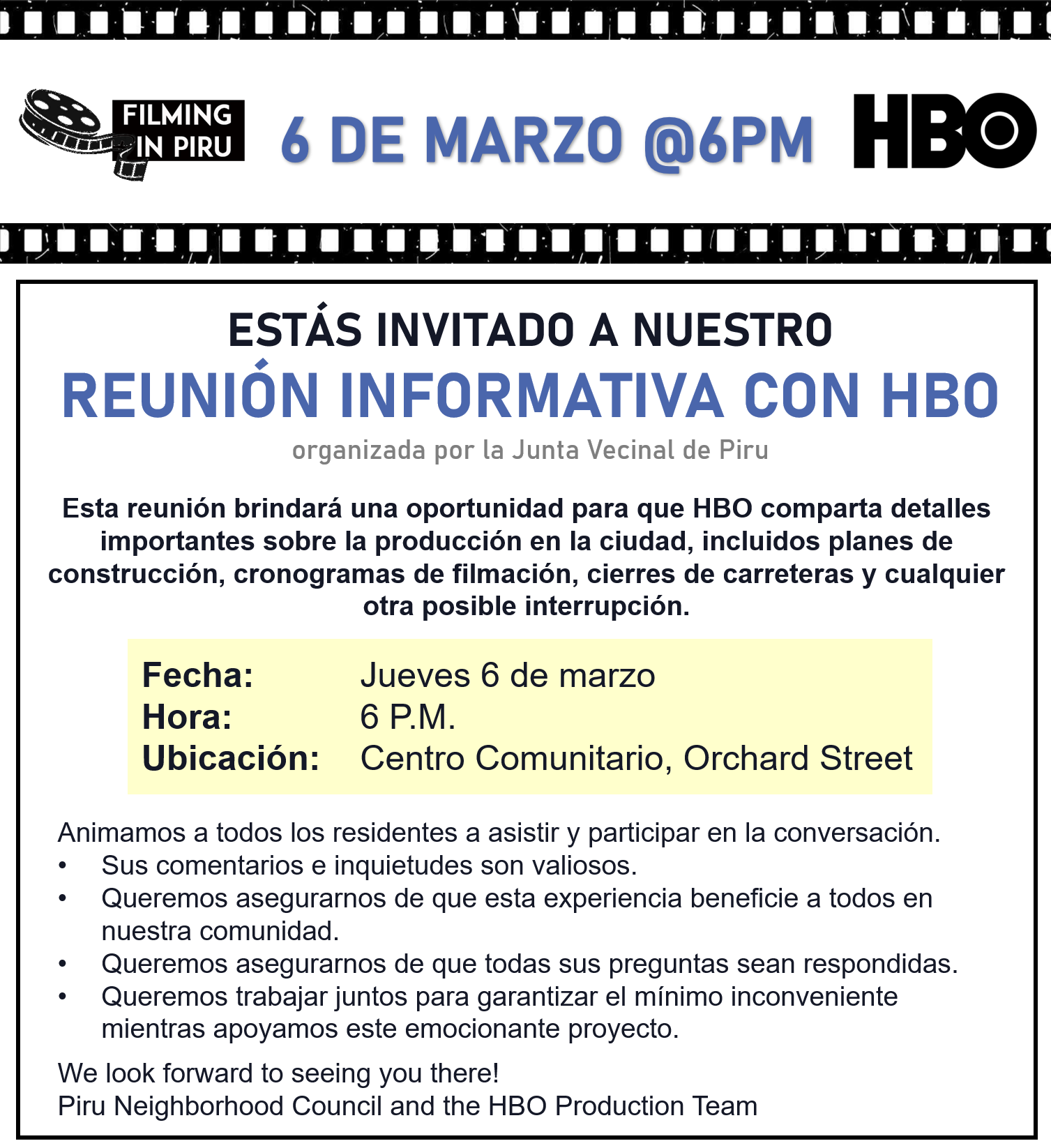 This meeting will provide an opportunity for HBO to share important details about the production, including plans for construction, filming schedules, road closures, and any other possible disruptions. We want to make sure all your questions are answered and that we work together to ensure minimal inconvenience while supporting this exciting project.